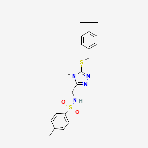 The synthesis of N-[(5-{[(4-tert-butylphenyl)methyl]sulfanyl}-4-methyl-4H-1,2,4-triazol-3-yl)methyl]-4-methylbenzene-1-sulfonamide typically involves multiple steps. One common route includes the formation of the triazole ring through a cyclization reaction, followed by the introduction of the sulfonamide group and the tert-butylphenyl moiety. The reaction conditions often require the use of catalysts, specific solvents, and controlled temperatures to ensure high yield and purity.