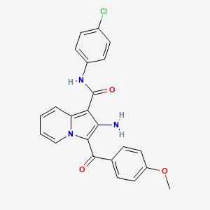 2-amino-N-(4-chlorophenyl)-3-(4-methoxybenzoyl)indolizine-1-carboxamide is a synthetic compound belonging to the indolizine class, known for its complex molecular structure and diverse biological activities. This compound has garnered interest in medicinal chemistry due to its potential applications in treating various diseases, particularly in oncology and virology.