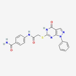 The synthesis of 4-[2-({4-oxo-1-phenyl-1H,4H,5H-pyrazolo[3,4-d]pyrimidin-6-yl}sulfanyl)acetamido]benzamide involves multiple steps. One common synthetic route includes the reaction of 4-oxo-1-phenyl-4,5-dihydro-1H-pyrazolo[3,4-d]pyrimidine-6-thiol with acetyl chloride to form the corresponding thioester. This intermediate is then reacted with 4-aminobenzamide under specific conditions to yield the final product . Industrial production methods may involve optimization of these steps to increase yield and purity, often using advanced techniques such as high-performance liquid chromatography (HPLC) for purification.