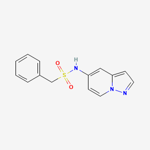 The synthesis of 1-phenyl-N-(pyrazolo[1,5-a]pyridin-5-yl)methanesulfonamide typically involves multi-step organic reactions. One common method includes the cyclization of appropriate precursors to form the pyrazolo[1,5-a]pyridine core, followed by functionalization to introduce the phenyl and methanesulfonamide groups. Specific reaction conditions, such as temperature, solvents, and catalysts, are optimized to achieve high yields and purity .