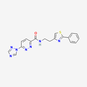 The synthesis of N-(2-(2-phenylthiazol-4-yl)ethyl)-6-(1H-1,2,4-triazol-1-yl)pyridazine-3-carboxamide typically involves multi-step organic reactions. The process begins with the preparation of the thiazole and triazole intermediates, followed by their coupling with a pyridazine derivative. Common reagents used in these reactions include thionyl chloride, hydrazine hydrate, and various catalysts to facilitate the formation of the desired product.