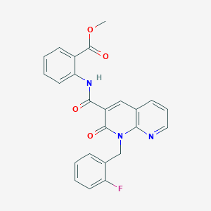 Methyl 2-{1-[(2-fluorophenyl)methyl]-2-oxo-1,2-dihydro-1,8-naphthyridine-3-amido}benzoate is a synthetic small molecule featuring a 1,8-naphthyridine core substituted with a 2-fluorobenzyl group at the N1 position and a methyl benzoate moiety linked via an amide bond at C3. The compound’s structure combines a bicyclic heteroaromatic system with fluorinated and ester-functionalized substituents, which are common pharmacophores in medicinal chemistry for modulating bioavailability and target binding .
