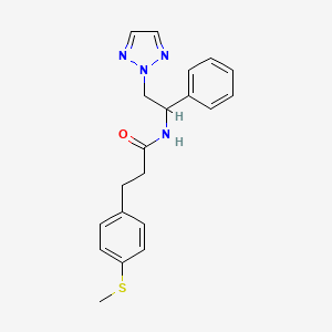 The synthesis of 3-(4-(methylthio)phenyl)-N-(1-phenyl-2-(2H-1,2,3-triazol-2-yl)ethyl)propanamide can be achieved through multi-step organic synthesis. One common approach is through the reaction of 4-(methylthio)benzaldehyde with an appropriate amine to form the corresponding Schiff base, followed by a cyclization reaction with an azide to introduce the triazole ring. The final step involves an amidation reaction to introduce the propanamide group. Reaction conditions typically include the use of organic solvents like dichloromethane, catalysts such as copper(I) iodide, and controlled temperatures.