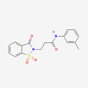 3-(1,1-Dioxido-3-oxobenzo[d]isothiazol-2(3H)-yl)-N-(m-tolyl)propanamide is a saccharin-derived compound featuring a propanamide linker connecting the benzoisothiazolone core to an m-tolyl (3-methylphenyl) substituent. Saccharin derivatives are widely studied for their diverse pharmacological properties, including anti-inflammatory, anticancer, and antimicrobial activities . The compound’s structure combines the electron-deficient benzoisothiazolone ring—a known pharmacophore for enzyme inhibition—with a lipophilic m-tolyl group, which may enhance membrane permeability and target binding .
