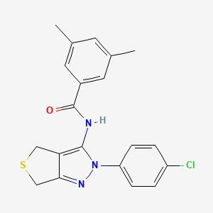 The synthesis of N-[2-(4-chlorophenyl)-2H,4H,6H-thieno[3,4-c]pyrazol-3-yl]-3,5-dimethylbenzamide typically involves multiple steps, starting with the preparation of the thieno[3,4-c]pyrazole core. This can be achieved through the cyclization of appropriate precursors under controlled conditions. The chlorophenyl group is introduced via a substitution reaction, and the final benzamide moiety is attached through an amide coupling reaction. The reaction conditions often require the use of catalysts, solvents, and specific temperature and pressure settings to ensure high yield and purity .