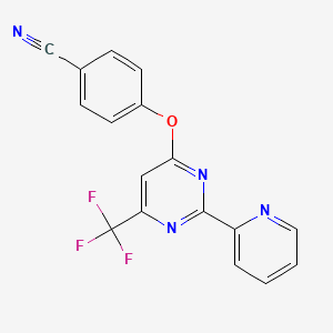 The mechanism of action of 4-{[2-(2-Pyridinyl)-6-(trifluoromethyl)-4-pyrimidinyl]oxy}benzenecarbonitrile involves its interaction with specific molecular targets. The trifluoromethyl group and the pyridine and pyrimidine rings play crucial roles in its binding affinity and activity. The compound can modulate various biochemical pathways, depending on its specific application .