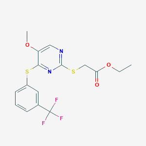The mechanism of action of Ethyl 2-((5-methoxy-4-((3-(trifluoromethyl)phenyl)sulfanyl)-2-pyrimidinyl)sulfanyl)acetate involves its interaction with specific molecular targets. The trifluoromethyl group enhances its lipophilicity, allowing it to easily penetrate cell membranes. The compound may interact with enzymes or receptors, modulating their activity and leading to various biological effects.