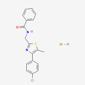 N-{[4-(4-chlorophenyl)-5-methyl-1,3-thiazol-2-yl]methyl}benzamide hydrobromide is a thiazole-based benzamide derivative with a hydrobromide salt formulation. Structurally, it comprises a thiazole ring substituted with a 4-chlorophenyl group at position 4, a methyl group at position 5, and a benzamide moiety linked via a methylene bridge to the thiazole’s position 2 (Figure 1). The hydrobromide salt likely enhances its solubility compared to the free base form, making it more suitable for pharmacological or biochemical studies .