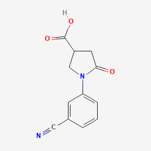 1-(3-Cyanophenyl)-5-oxopyrrolidine-3-carboxylic acid is a pyrrolidinone derivative featuring a 3-cyanophenyl substituent. Pyrrolidinone scaffolds are widely studied for their diverse pharmacological activities, including antioxidant, antimicrobial, and anticancer properties . The 3-cyanophenyl group introduces a strong electron-withdrawing moiety, which may influence electronic properties, lipophilicity, and binding interactions compared to other substituents.