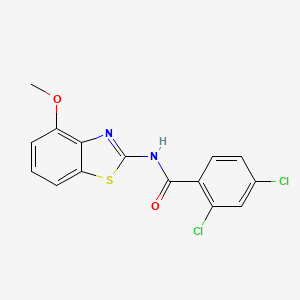 The synthesis of 2,4-dichloro-N-(4-methoxy-1,3-benzothiazol-2-yl)benzamide typically involves the reaction of 2,4-dichlorobenzoic acid with 4-methoxy-1,3-benzothiazol-2-amine. The reaction is usually carried out in the presence of a coupling agent such as N,N’-dicyclohexylcarbodiimide (DCC) and a catalyst like 4-dimethylaminopyridine (DMAP) in an organic solvent such as dichloromethane. The reaction mixture is stirred at room temperature for several hours to yield the desired product .