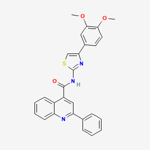 The synthesis of N-[4-(3,4-dimethoxyphenyl)-1,3-thiazol-2-yl]-2-phenylquinoline-4-carboxamide typically involves multi-step organic reactions. One common method starts with the preparation of the thiazole ring, which can be synthesized by reacting 3,4-dimethoxybenzaldehyde with thiosemicarbazide under acidic conditions to form the corresponding thiosemicarbazone. This intermediate is then cyclized to form the thiazole ring.