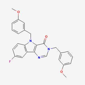 The compound's IUPAC name is 8-fluoro-3,5-bis[(3-methoxyphenyl)methyl]-3H,4H-pyrimido[5,4-b]indol-4-one. It has a molecular formula of C26H22FN3O3 and a molecular weight of 441.47 g/mol. The presence of the fluorine atom and methoxy groups enhances its lipophilicity and potential receptor interactions.
