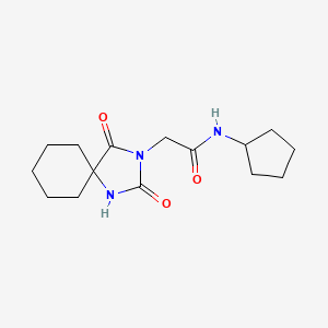 Synthetic Routes and Reaction Conditions: The synthesis of N-cyclopentyl-2-(2,4-dioxo-1,3-diazaspiro[4.5]dec-3-yl)acetamide typically involves the reaction of cyclopentanone with a suitable amine to form the spirocyclic core. This is followed by acylation to introduce the acetamide group. The reaction conditions often require the use of organic solvents and catalysts to facilitate the formation of the spirocyclic structure .