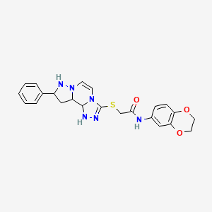 InChI=1S/C23H24N6O3S/c30-21(24-16-6-7-19-20(12-16)32-11-10-31-19)14-33-23-26-25-22-18-13-17(15-4-2-1-3-5-15)27-29(18)9-8-28(22)23/h1-9,12,17-18,22,25,27H,10-11,13-14H2,(H,24,30) | |