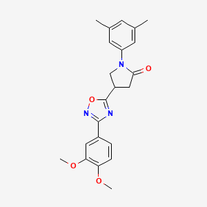 This compound is a heterocyclic organic molecule featuring a pyrrolidin-2-one core substituted with a 1,2,4-oxadiazole ring and aromatic groups. The oxadiazole moiety (a five-membered ring containing two nitrogen and one oxygen atom) is linked to a 3,4-dimethoxyphenyl group, while the pyrrolidinone nitrogen is substituted with a 3,5-dimethylphenyl group. The 3,4-dimethoxy substitution on the phenyl ring may enhance lipophilicity and influence binding affinity, while the 3,5-dimethylphenyl group could modulate steric effects and metabolic stability.
