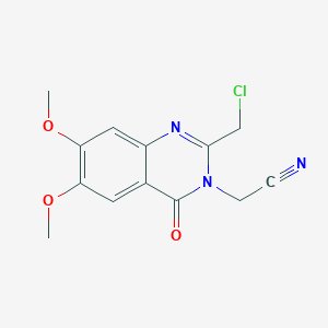 2-[2-(Chloromethyl)-6,7-dimethoxy-4-oxo-3,4-dihydroquinazolin-3-yl]acetonitrile is a quinazolinone derivative characterized by a bicyclic core structure with a 4-oxo-3,4-dihydroquinazolin-3-yl moiety. Key substituents include a chloromethyl group at position 2, dimethoxy groups at positions 6 and 7, and an acetonitrile side chain. Its chloromethyl group enhances reactivity, enabling nucleophilic substitution reactions, while the dimethoxy groups may influence solubility and electronic properties .