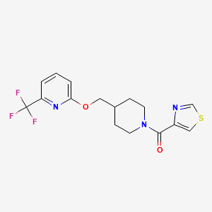 The synthesis of 2-{[1-(1,3-Thiazole-4-carbonyl)piperidin-4-yl]methoxy}-6-(trifluoromethyl)pyridine typically involves multi-step organic synthesis. One common route starts with the preparation of the thiazole ring, followed by the formation of the piperidine ring, and finally, the coupling with the pyridine ring.