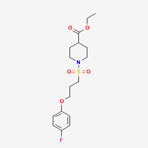 Ethyl 1-((3-(4-fluorophenoxy)propyl)sulfonyl)piperidine-4-carboxylate is a piperidine-based compound characterized by a sulfonyl group linked to a 3-(4-fluorophenoxy)propyl chain at the nitrogen position and an ethyl ester at the 4-carboxylate position of the piperidine ring.