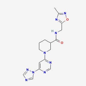 This compound is a heterocyclic small molecule featuring a pyrimidine core substituted with a 1,2,4-triazole moiety at the 6-position. The pyrimidine ring is further linked to a piperidine-3-carboxamide scaffold, which is N-substituted with a (3-methyl-1,2,4-oxadiazol-5-yl)methyl group. The triazole and oxadiazole groups may enhance metabolic stability and binding affinity, while the piperidine-carboxamide moiety could contribute to solubility and membrane permeability.