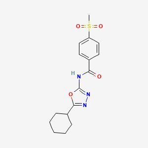 N-(5-Cyclohexyl-1,3,4-oxadiazol-2-yl)-4-(methylsulfonyl)benzamide is a synthetic small molecule featuring a 1,3,4-oxadiazole core substituted at position 5 with a cyclohexyl group and at position 2 with a benzamide moiety bearing a methylsulfonyl (-SO₂CH₃) substituent at the para position of the benzene ring.