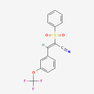 The mechanism by which (2E)-2-(benzenesulfonyl)-3-[3-(trifluoromethoxy)phenyl]prop-2-enenitrile exerts its effects depends on its specific application. In medicinal chemistry, it may interact with molecular targets such as enzymes or receptors, modulating their activity through binding interactions. The trifluoromethoxy group can enhance the compound’s lipophilicity, improving its ability to cross cell membranes and reach intracellular targets.