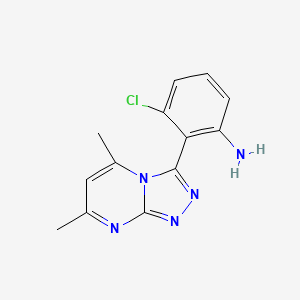 The synthesis of 3-Chloro-2-{5,7-dimethyl-[1,2,4]triazolo[4,3-a]pyrimidin-3-yl}aniline typically involves the construction of the triazolo[4,3-a]pyrimidine ring system followed by the introduction of the aniline moiety. One common synthetic route starts with the cyclization of appropriate precursors to form the triazolo[4,3-a]pyrimidine core. This can be achieved through the reaction of 5,7-dimethyl-1,2,4-triazole with a suitable chlorinated pyrimidine derivative under acidic or basic conditions . The resulting intermediate is then subjected to nucleophilic substitution with aniline to yield the final product .