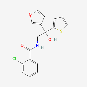 2-chloro-N-[2-(furan-3-yl)-2-hydroxy-2-(thiophen-2-yl)ethyl]benzamide is a complex organic compound that integrates a furan ring, a thiophene moiety, and a benzamide functional group. The unique structural features of this compound suggest potential biological activities, which have attracted interest in medicinal chemistry and pharmacology.