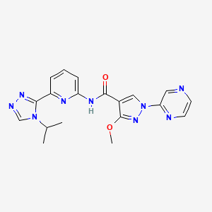 N-(6-(4-Isopropyl-4H-1,2,4-triazol-3-yl)pyridin-2-yl)-3-methoxy-1-(pyrazin-2-yl)-1H-pyrazole-4-carboxamide is a heterocyclic compound featuring a pyridine core substituted with a 4-isopropyl-1,2,4-triazole moiety at the 6-position. The pyrazole ring at position 4 is functionalized with a methoxy group and a pyrazine substituent. This structure combines multiple aromatic systems (pyridine, pyrazole, pyrazine) and a triazole ring, which are common in medicinal chemistry due to their hydrogen-bonding capabilities and metabolic stability .