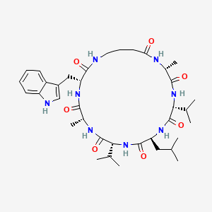 InChI=1S/C37H56N8O7/c1-19(2)16-27-35(50)45-30(20(3)4)36(51)41-23(8)32(47)42-28(17-24-18-39-26-13-10-9-12-25(24)26)34(49)38-15-11-14-29(46)40-22(7)33(48)44-31(21(5)6)37(52)43-27/h9-10,12-13,18-23,27-28,30-31,39H,11,14-17H2,1-8H3,(H,38,49)(H,40,46)(H,41,51)(H,42,47)(H,43,52)(H,44,48)(H,45,50)/t22-,23-,27+,28-,30-,31-/m1/s1 | |