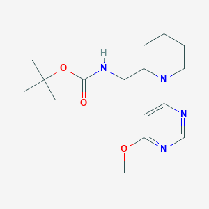 The mechanism of action of tert-Butyl ((1-(6-methoxypyrimidin-4-yl)piperidin-2-yl)methyl)carbamate involves its interaction with specific molecular targets, such as enzymes or receptors. The compound’s structure allows it to bind to these targets, potentially inhibiting their activity or modulating their function. The exact pathways involved depend on the specific application and target .