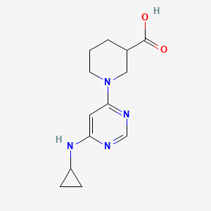 The mechanism of action of 1-(6-(Cyclopropylamino)pyrimidin-4-yl)piperidine-3-carboxylic acid involves its interaction with specific molecular targets, such as enzymes or receptors. The compound may inhibit enzyme activity by binding to the active site or allosteric sites, thereby preventing substrate binding and catalysis. Additionally, it may modulate receptor activity by acting as an agonist or antagonist, influencing downstream signaling pathways .