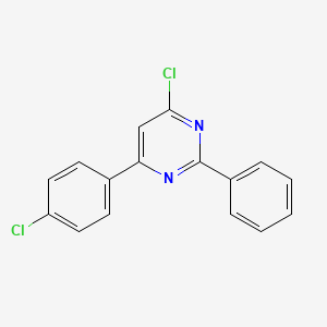 The mechanism of action of 4-Chloro-6-(4-chlorophenyl)-2-phenylpyrimidine involves its interaction with specific molecular targets. The compound can bind to enzymes or receptors, inhibiting their activity or altering their function. The exact pathways and targets depend on the specific application and the biological system being studied. For example, in antimicrobial research, the compound may inhibit bacterial enzymes essential for cell wall synthesis, leading to bacterial cell death.