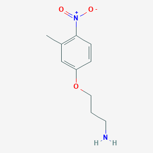 A comprehensive review of publicly accessible scientific literature and academic databases reveals a significant scarcity of dedicated research focused specifically on the chemical compound 3-(3-Methyl-4-nitrophenoxy)propan-1-amine . While the compound is listed in several chemical supplier catalogs, indicating its availability for research and commercial purposes, there is a notable absence of peer-reviewed studies detailing its synthesis, characterization, or potential applications. As such, there are no specific academic research findings to summarize for this particular molecule at this time. The scientific community has yet to publish detailed investigations into its chemical, physical, or biological properties.
