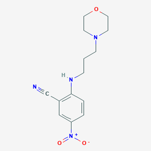 The synthesis of 2-[(3-Morpholin-4-ylpropyl)amino]-5-nitrobenzonitrile typically involves the reaction of 2-chloro-5-nitrobenzonitrile with 3-(morpholin-4-yl)propylamine. The reaction is carried out in the presence of a base, such as potassium carbonate, in a suitable solvent like dimethylformamide (DMF) at elevated temperatures. The reaction proceeds through nucleophilic substitution, where the amine group displaces the chlorine atom on the benzonitrile ring.