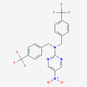 The synthesis of 5-nitro-N,N-bis[4-(trifluoromethyl)benzyl]-2-pyrimidinamine typically involves multiple steps, starting from readily available precursors. One common synthetic route involves the reaction of 5-nitro-2-pyrimidinamine with 4-(trifluoromethyl)benzyl chloride in the presence of a base such as potassium carbonate. The reaction is usually carried out in an organic solvent like dimethylformamide under reflux conditions. Industrial production methods may involve similar steps but are optimized for large-scale synthesis, including the use of continuous flow reactors and automated systems to ensure high yield and purity.
