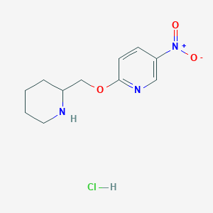 The mechanism of action of 5-Nitro-2-(piperidin-2-ylmethoxy)-pyridine hydrochloride depends on its specific application. In biological systems, the nitro group can undergo bioreduction to form reactive intermediates that interact with cellular components, leading to various biological effects. The piperidin-2-ylmethoxy group may enhance the compound’s binding affinity to specific molecular targets, such as enzymes or receptors, thereby modulating their activity.
