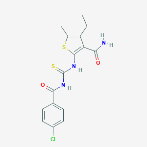 InChI=1S/C16H16ClN3O2S2/c1-3-11-8(2)24-15(12(11)13(18)21)20-16(23)19-14(22)9-4-6-10(17)7-5-9/h4-7H,3H2,1-2H3,(H2,18,21)(H2,19,20,22,23) | |