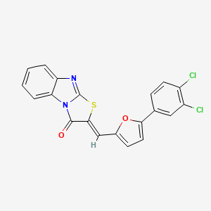 (2Z)-2-{[5-(3,4-Dichlorophenyl)furan-2-yl]methylidene}[1,3]thiazolo[3,2-a]benzimidazol-3(2H)-one is a heterocyclic compound featuring a thiazolo[3,2-a]benzimidazolone core fused with a dichlorophenyl-substituted furan moiety. The compound’s synthesis typically involves condensation reactions between thiazolo[3,2-a]benzimidazolone derivatives and aldehydes or ketones, as exemplified in studies on analogous systems . Its structural complexity necessitates advanced characterization techniques, including X-ray crystallography (as highlighted in ) and NMR spectroscopy .