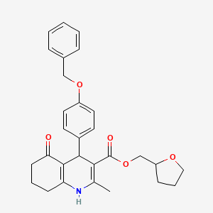 The synthesis of Tetrahydrofuran-2-ylmethyl 4-[4-(benzyloxy)phenyl]-2-methyl-5-oxo-1,4,5,6,7,8-hexahydroquinoline-3-carboxylate typically involves multi-step organic reactions. One common method involves the condensation of tetrahydrofuran-2-ylmethanol with 4-[4-(benzyloxy)phenyl]-2-methyl-5-oxo-1,4,5,6,7,8-hexahydroquinoline-3-carboxylic acid under acidic conditions. The reaction is usually carried out in the presence of a dehydrating agent such as thionyl chloride or phosphorus oxychloride to facilitate the esterification process.