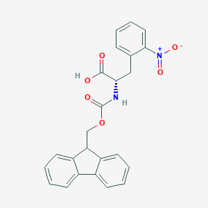 Fmoc-L-2-Nitrophenylalanine plays a significant role in biochemical reactions, particularly in the synthesis of peptides. The Fmoc group serves as a protecting group for the amino group, preventing unwanted reactions during peptide chain elongation. This compound interacts with various enzymes and proteins involved in peptide synthesis, such as peptidyl transferases and proteases. The nitro group on the phenyl ring can participate in redox reactions, influencing the overall reactivity of the compound. Fmoc-L-2-Nitrophenylalanine is also known to interact with other biomolecules, including nucleic acids and lipids, through non-covalent interactions such as hydrogen bonding and π-π stacking.