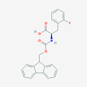 This compound, also known as Fmoc-2-fluoro-D-phenylalanine, is a synthetic amino acid derivative. The presence of a fluorine atom on the phenyl ring can alter the conformational properties and metabolic stability of peptides incorporating this moiety. The fluorenylmethoxycarbonyl (Fmoc) group is a base-labile protecting group for the amine functionality, essential for solid-phase peptide synthesis.
