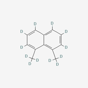 1,8-Dimethylnaphthalene-D12 (C₁₂D₁₂) is the deuterated isotopologue of 1,8-dimethylnaphthalene, a polycyclic aromatic hydrocarbon (PAH). In scientific research, particularly in analytical and environmental chemistry, isotopically labeled compounds are invaluable tools. This compound serves as an excellent internal standard for the quantification of PAHs in various matrices. Its physical and chemical properties are nearly identical to its non-deuterated counterpart, with the key difference being its increased mass. This property allows for its use in isotope dilution mass spectrometry (IDMS), a highly accurate and precise analytical technique. This guide provides a comprehensive overview of the physical and chemical properties of this compound, its synthesis, and its primary application as an internal standard.