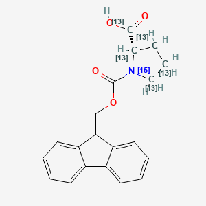 This compound is a specialized chemical reagent used in solid-phase peptide synthesis (SPPS). The N-α-9-fluorenylmethoxycarbonyl (Fmoc) protecting group allows for the controlled, stepwise addition of the proline amino acid into a peptide chain. The key feature of this particular proline derivative is its isotopic enrichment: the five carbon atoms are replaced with the heavy isotope Carbon-13 (¹³C), and the nitrogen atom is replaced with the heavy isotope Nitrogen-15 (¹⁵N). This labeling results in a precisely defined mass increase compared to its natural counterpart, making it an ideal internal standard for quantitative mass spectrometry-based proteomics.