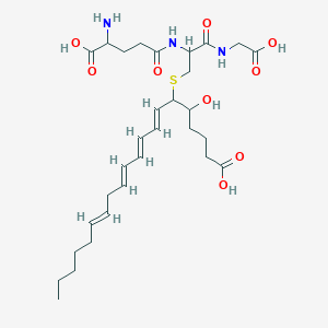 (7E,9E,11E,14E)-6-[2-[(4-amino-4-carboxybutanoyl)amino]-3-(carboxymethylamino)-3-oxopropyl]sulfanyl-5-hydroxyicosa-7,9,11,14-tetraenoic acid is a complex fatty acid derivative known for its significant biological activities. This compound is structurally related to eicosanoids, which are lipid mediators that play crucial roles in various physiological processes including inflammation and immune responses.