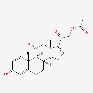 3,11,20-Trioxopregna-1,4,16-trien-21-yl acetate is a synthetic steroidal compound with the molecular formula C23H26O5. It is characterized by the presence of three keto groups at positions 3, 11, and 20, and an acetate group at position 21. This compound is notable for its biological activity primarily through its interaction with steroid hormone receptors, influencing various cellular processes and gene expression.