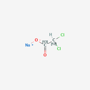 Sodium dichloroacetate-13C₂ (molecular formula: ¹³C₂HCl₂NaO₂; molecular weight: 152.91 g/mol) is isotopically labeled, enabling precise tracking in metabolic or pharmacokinetic studies. Its solubility in water and stability under varying pH conditions are critical for designing dissolution assays or in vitro metabolic models. Researchers must verify isotopic purity (≥99 atom% ¹³C) using mass spectrometry or nuclear magnetic resonance (NMR) to ensure data reliability .