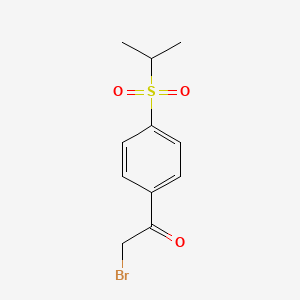 The mechanism of action of 2-Bromo-1-(4-(isopropylsulfonyl)phenyl)ethanone involves its interaction with molecular targets through its reactive bromine and carbonyl groups. These functional groups can form covalent bonds with nucleophilic sites on proteins or other biomolecules, leading to inhibition or modification of their activity. The isopropylsulfonyl group enhances the compound’s solubility and stability, facilitating its use in various applications .