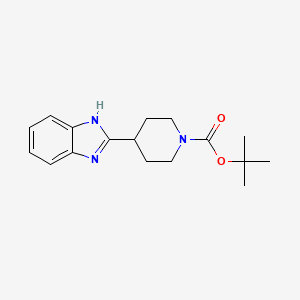 Tert-butyl 4-(1H-benzo[d]imidazol-2-yl)piperidine-1-carboxylate (CAS 953071-73-3) is a key intermediate in pharmaceutical synthesis, notably for the second-generation antihistamine Bilastine . Its structure combines a tert-butyl carbamate group with a benzimidazole-piperidine scaffold, offering both stability and functional versatility . The compound is synthesized via a three-step process involving coupling reactions and recrystallization, achieving yields up to 90% . It is characterized by a molecular weight of 301.38 g/mol and is stored under dry, cool conditions (2–8°C) to maintain stability .