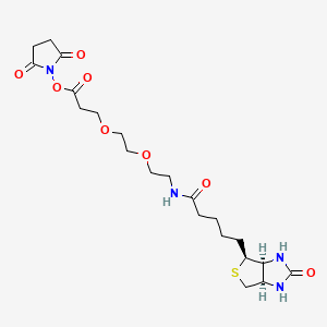The synthesis of the this compound itself involves the activation of the carboxylic acid group of Biotin-PEG2-COOH. This is commonly achieved using carbodiimides, such as 1-ethyl-3-(3-dimethylaminopropyl)carbodiimide (B157966) (EDCI) or dicyclohexylcarbodiimide (B1669883) (DCC), in the presence of N-hydroxysuccinimide (NHS). The carbodiimide (B86325) first reacts with the carboxylic acid to form a highly reactive O-acylisourea intermediate. This intermediate is then readily attacked by the hydroxyl group of NHS, leading to the formation of the more stable NHS ester and a urea (B33335) byproduct.
