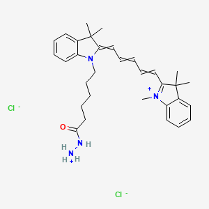 The hydrazide functional group (-CONHNH2) is a key component of Cyanine5 hydrazide, enabling its use in targeted bioconjugation reactions. Hydrazides react specifically with carbonyl groups, such as aldehydes and ketones, to form stable hydrazone bonds. lumiprobe.com This reactivity is particularly useful for labeling glycoproteins, as the sugar moieties can be gently oxidized with sodium periodate (B1199274) to generate aldehyde groups. lumiprobe.cominterchim.fr This method offers a significant advantage over more common labeling strategies that target amine groups (e.g., using NHS esters), as glycoproteins often have their glycosylation sites located away from their active binding domains. lumiprobe.com Consequently, labeling via the glycan portion is less likely to interfere with the biological activity of the protein. The reaction between a hydrazide and an aldehyde is efficient and can be performed under mild, biologically compatible conditions. papyrusbio.com